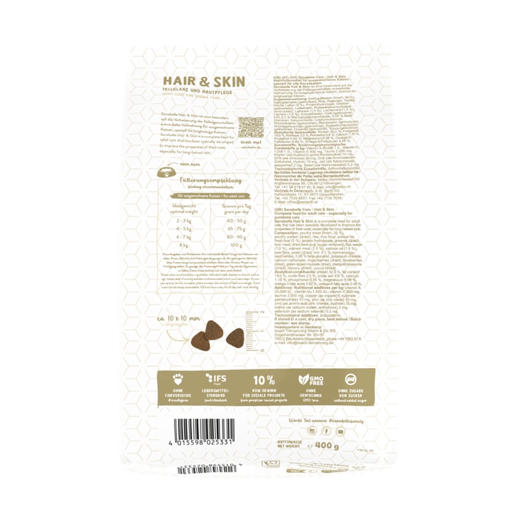 Кроме всего прочего, даже самый привередливый хвостатый гурман непременно оценит изысканный вкус этого рациона: прекрасно подобранный натуральный состав, гармоничное соотношение мяса птицы и лосося обеспечивают крокетам неповторимый аромат и повышенную вкусовую привлекательность. Если Ваша кошечка имеет особые гастрономические предпочтения, Вам обязательно стоит купить для нее Sanabelle Hair&Skin - она останется полностью довольна Вашим выбором! Хотите убедиться в этом? Нет ничего проще, ведь в нашем интернет-магазине такой корм можно купить по привлекательной цене и с доставкой.