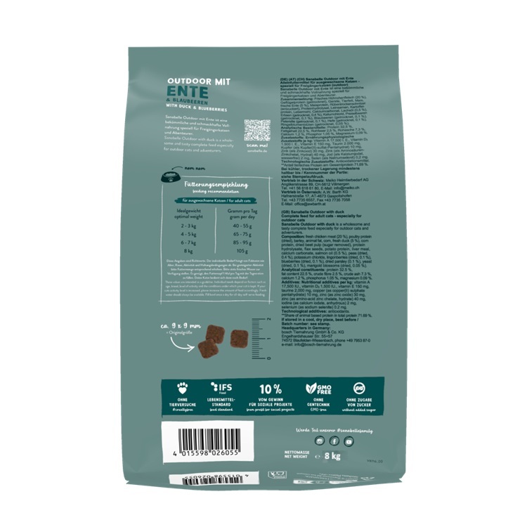 Будь то смелый охотник или любопытный бродячий – с Sanabelle Outdoor со свежей уткой и черникой, о вашей кошке полностью заботятся: соответствующая виду, энергичная и полная удовольствия.
