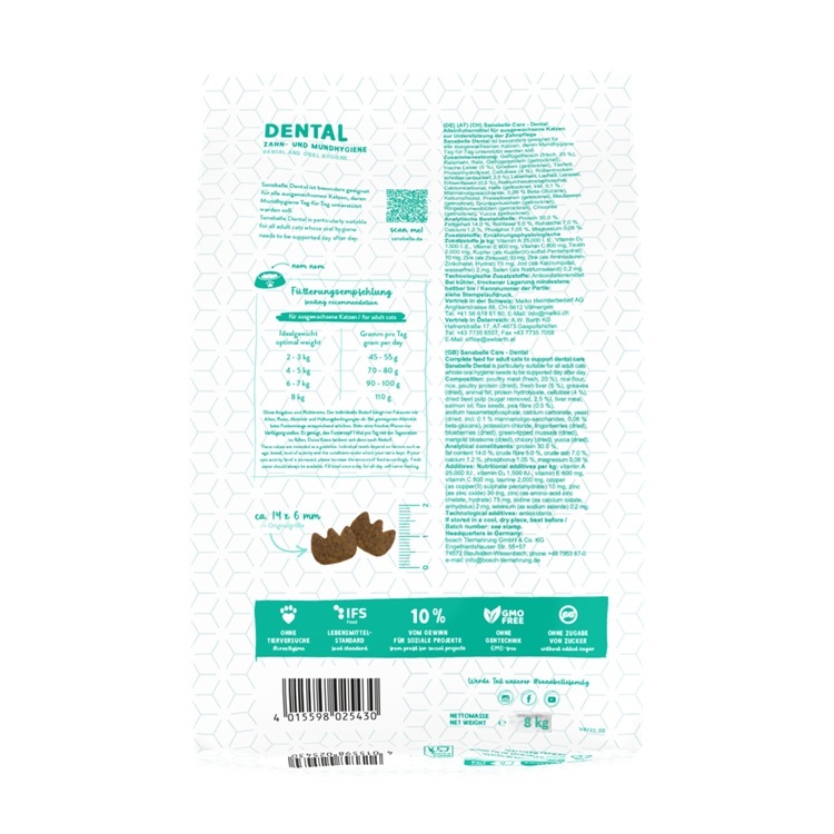 Благодаря специальной структуре и составу Bosch Sanabelle Dental не только дарит кошке гастрономическое наслаждение, но и бережно очищает зубную эмаль, положительно влияет на микрофлору ротовой полости и препятствует возникновению различных заболеваний