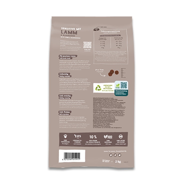 В том, что данный рацион чудесно удовлетворяет питательные потребности одомашненного хищника, уже успели удостовериться многие хозяева: уже после непродолжительного употребления Sanabelle Sensitive хвостатики избавляются от проблем с пищеварением, становятся более активными, игривыми и устойчивыми к болезням. Все благодаря тому, что каждый нутриент здесь находится в оптимальном количестве: нежное мясо ягненка, богатое белками, питательными жирами и аминокислотами, обеспечивает кошку качественной энергией, способствует формированию мышц и тканей, повышает иммунитет, а за счет сниженного уровня холестерина удерживает вес в пределах нормы. Увеличенная калорийность отлично возмещает энергозатраты активных кошек и позволяет Вашему питомцу оставаться активным в течение всего дня, наличие витаминов группы В служит поддержкой для нервной, кровеносной систем и здоровья кожи. За счет присутствия жирных кислот Омега-3-6 корм контролирует состояние шерстного покрова, снижает интенсивность линьки и профилактирует возникновение аллергических реакций. Клетчатка и балластные вещества способствуют стабилизации кишечной флоры и правильной работе пищеварительной системы, а комплекс особых компонентов в сочетании с водными транзит-агентами следят за уровнем рН в организме и препятствуют образованию камней в почках.